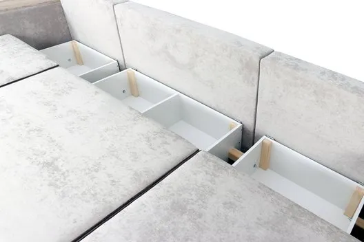 С одной стороны расположена боковина с нишей, с другой – ящики. Надежные петли с доводчиками добавляют комфортности использования мебели. Диван-трансформер может быть прямым, угловым и П-образным. Малые декоративные подушки входят в комплект дивана.