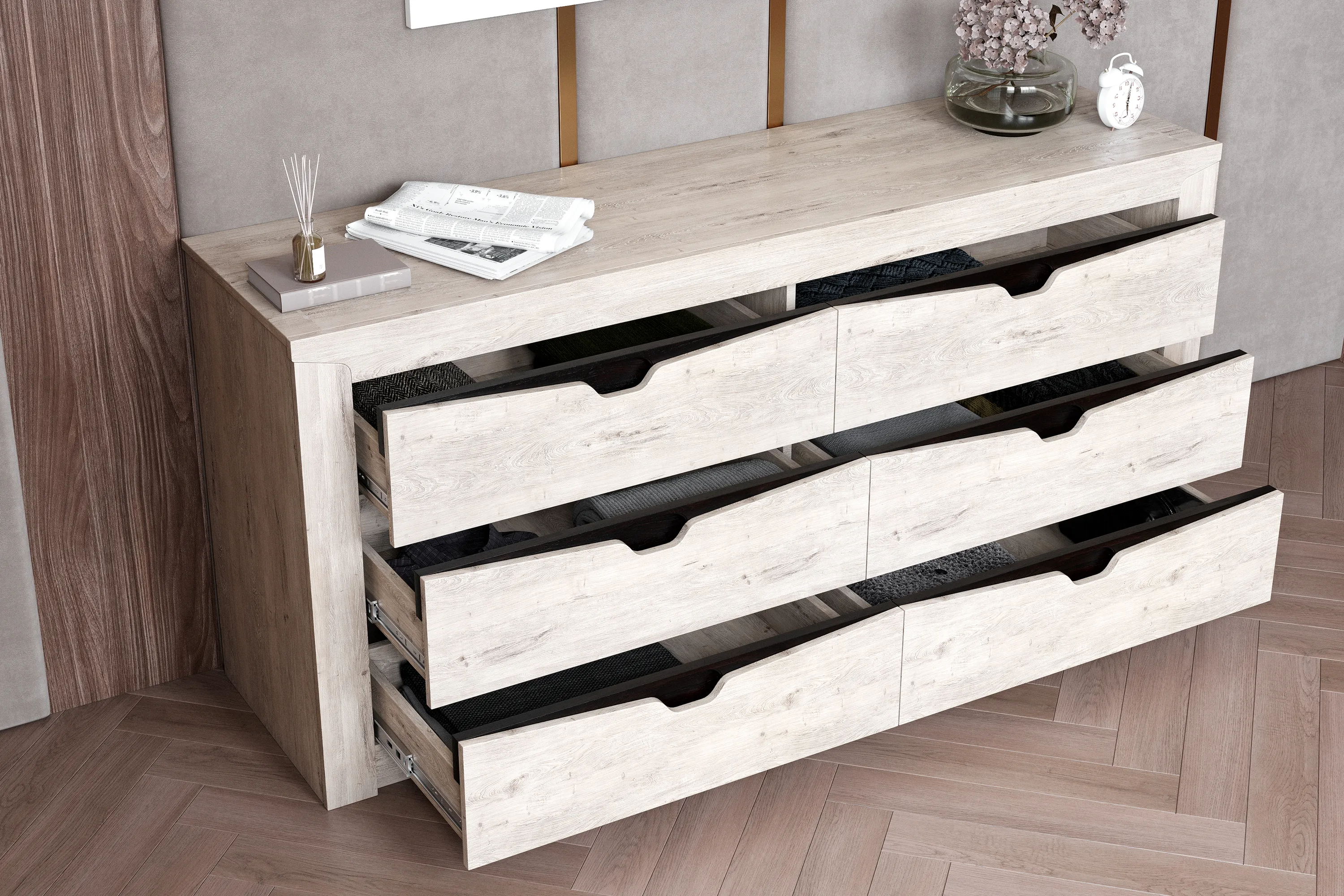 Комод "Соренто" идеально подойдёт для спальни и станет прекрасным дополнением к вашему интерьеру. Шесть вместительных выдвижных ящиков на шариковых направляющих позволяют хранить множество вещей, таких как одежда, белье, аксессуары. В фасадах ящиков имеются декоративные вырезы, выполняющие функцию ручек в цвете кофе структурный матовый.