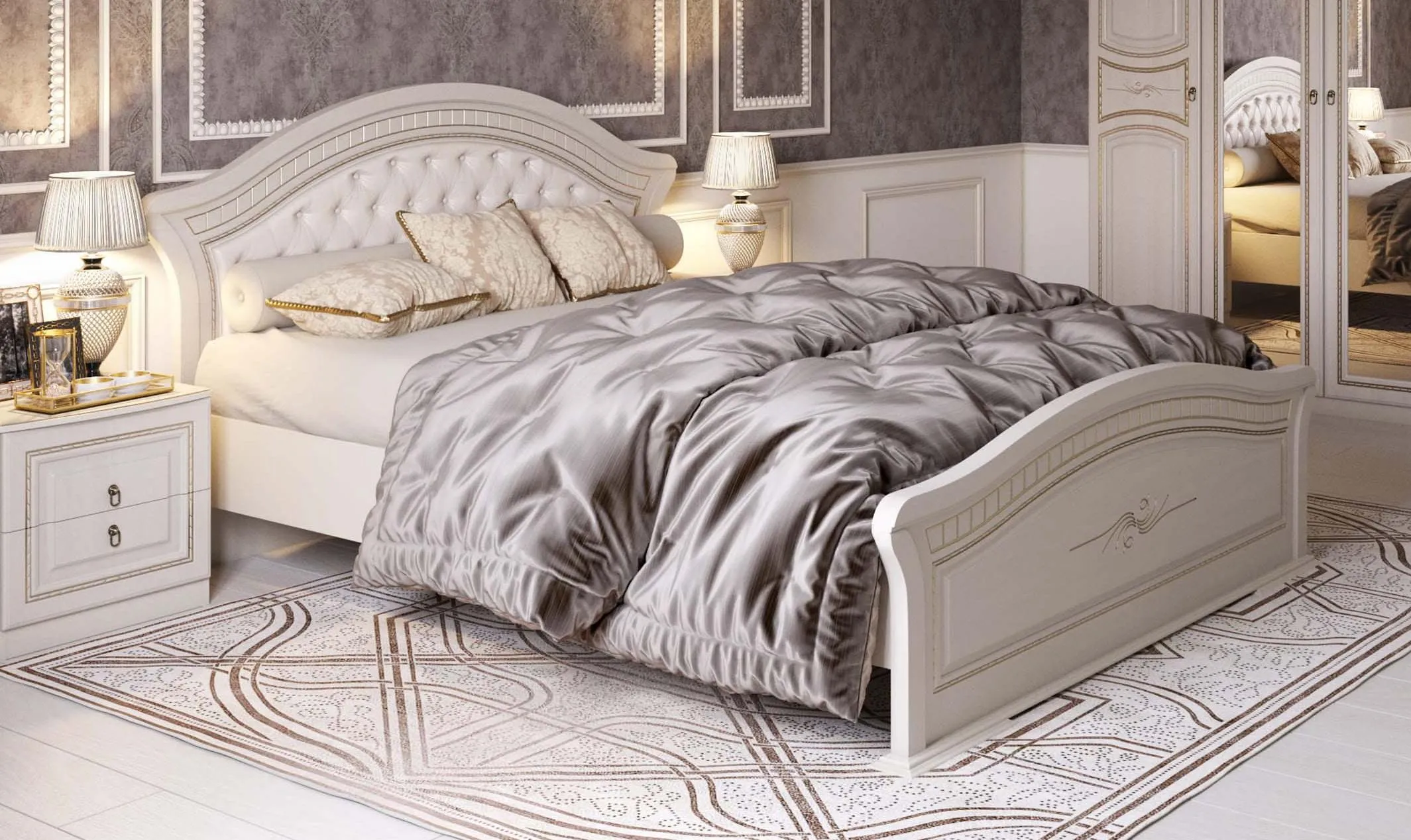 Фасад декорирован элегантной фрезеровкой с эффектом патины. Кровать в цветовом решении "Ясень жемчужный / Ваниль" придаст интерьеру воздушность, ощущение роскоши, нежности и легкости, наполнив спальную комнату светом.