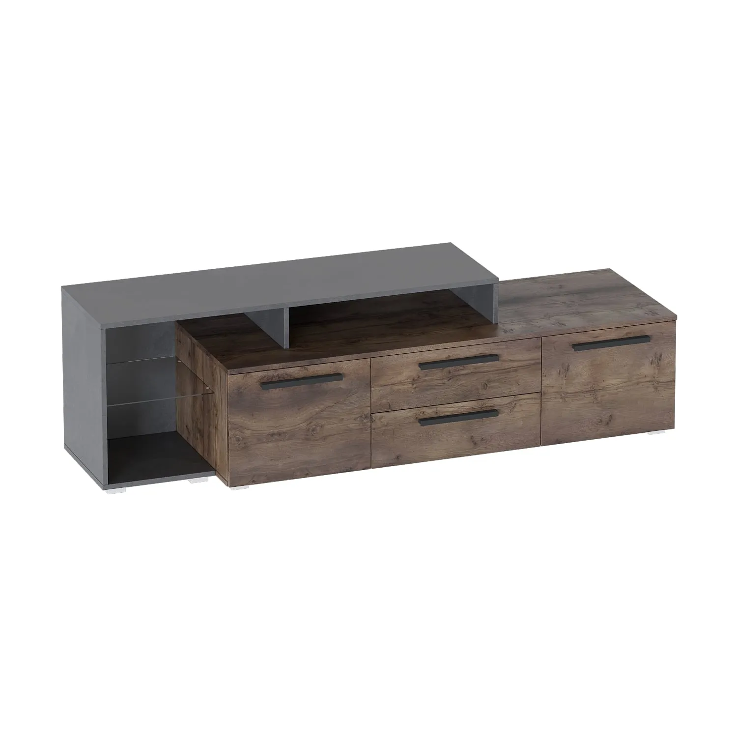 Правая часть тумбы выполнена в виде надстройки и оснащено одной стеклянной полкой. Тумба комплектуется петлями с плавным закрыванием.