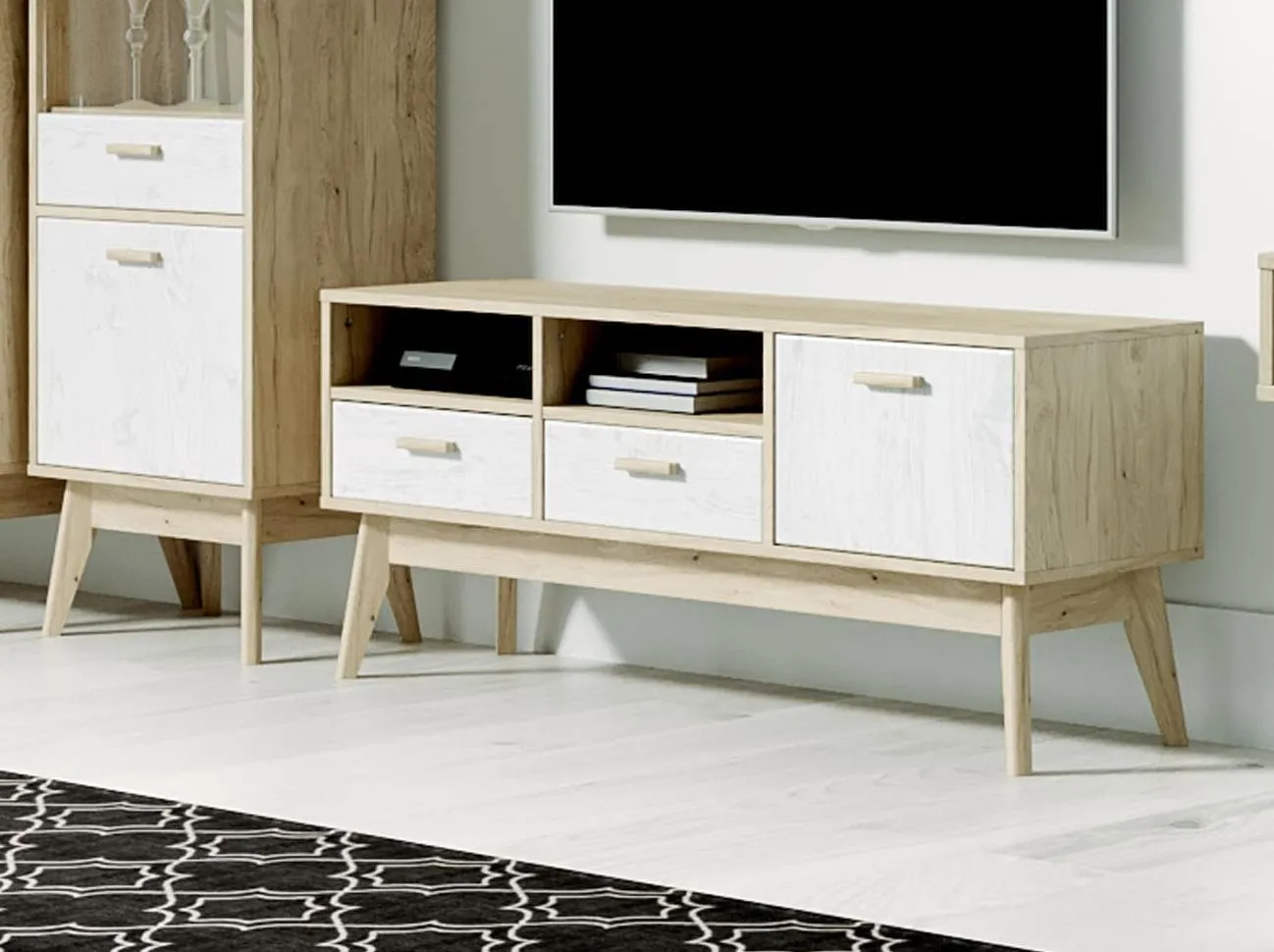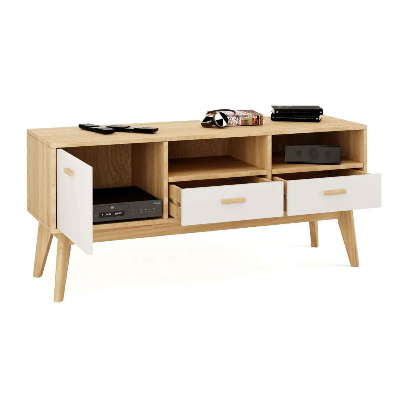 Упорядочить хранение сопутствующих аксессуаров и компонентов домашнего кинотеатра помогут выдвижные ящики с фасадами из белоснежного МДФ, секция с распашной дверцей и открытые ниши. Корпус изделия выполнен из ЛДСП, высокие стильные опоры и ручки - из массива березы.