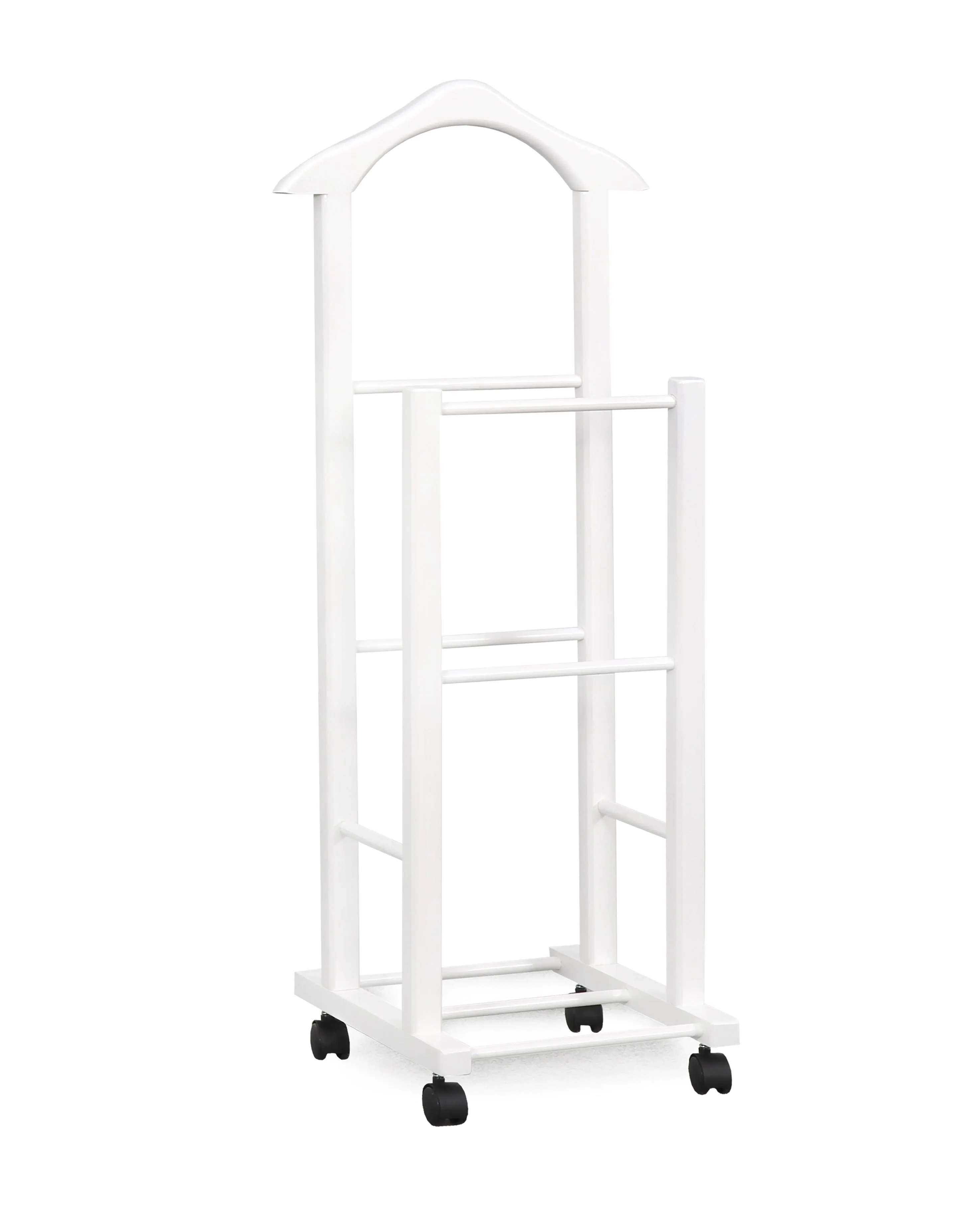 Более высокая стойка высотой почти метр и шириной почти полметра имеет закруглённую верхнюю планку. Такая форма удобна для навешивания одежды с рукавами, а габариты вешалки позволяют размещать наряды даже очень крупных пользователей. На нижней планке удобно расположить брюки и юбки.